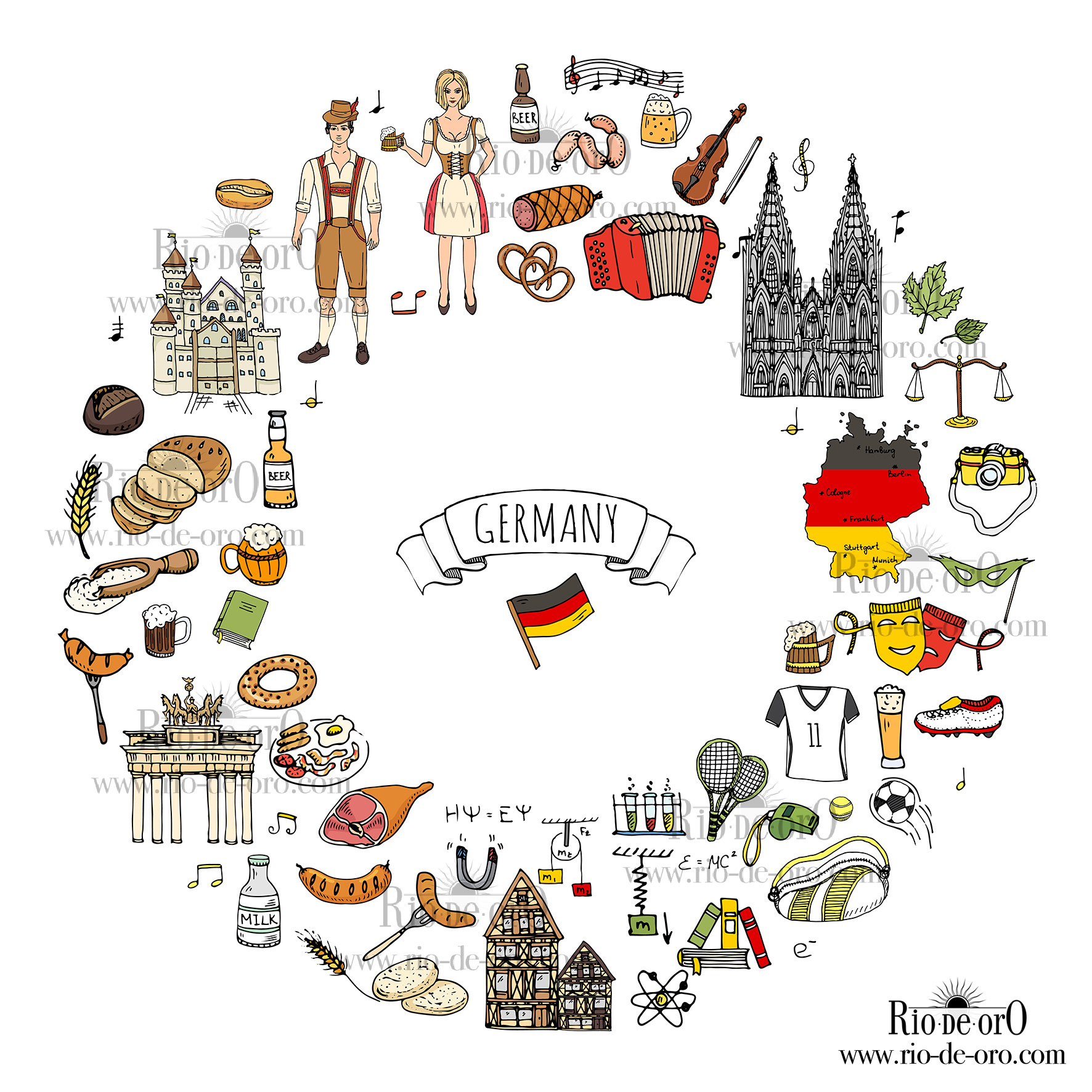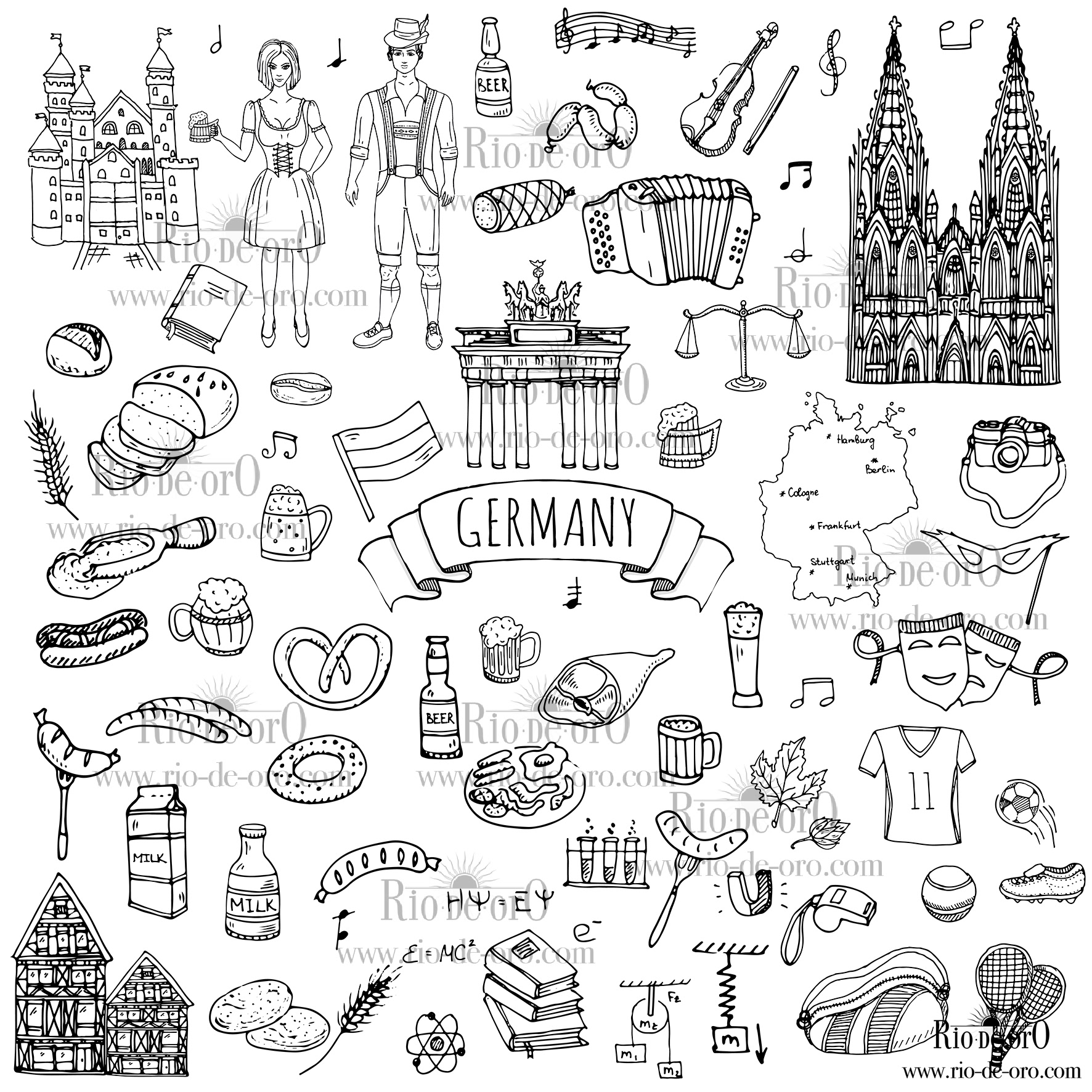 Hand drawn doodle set of Germany icons. Cartoon German landmark. Sketchy traveling elements collection.